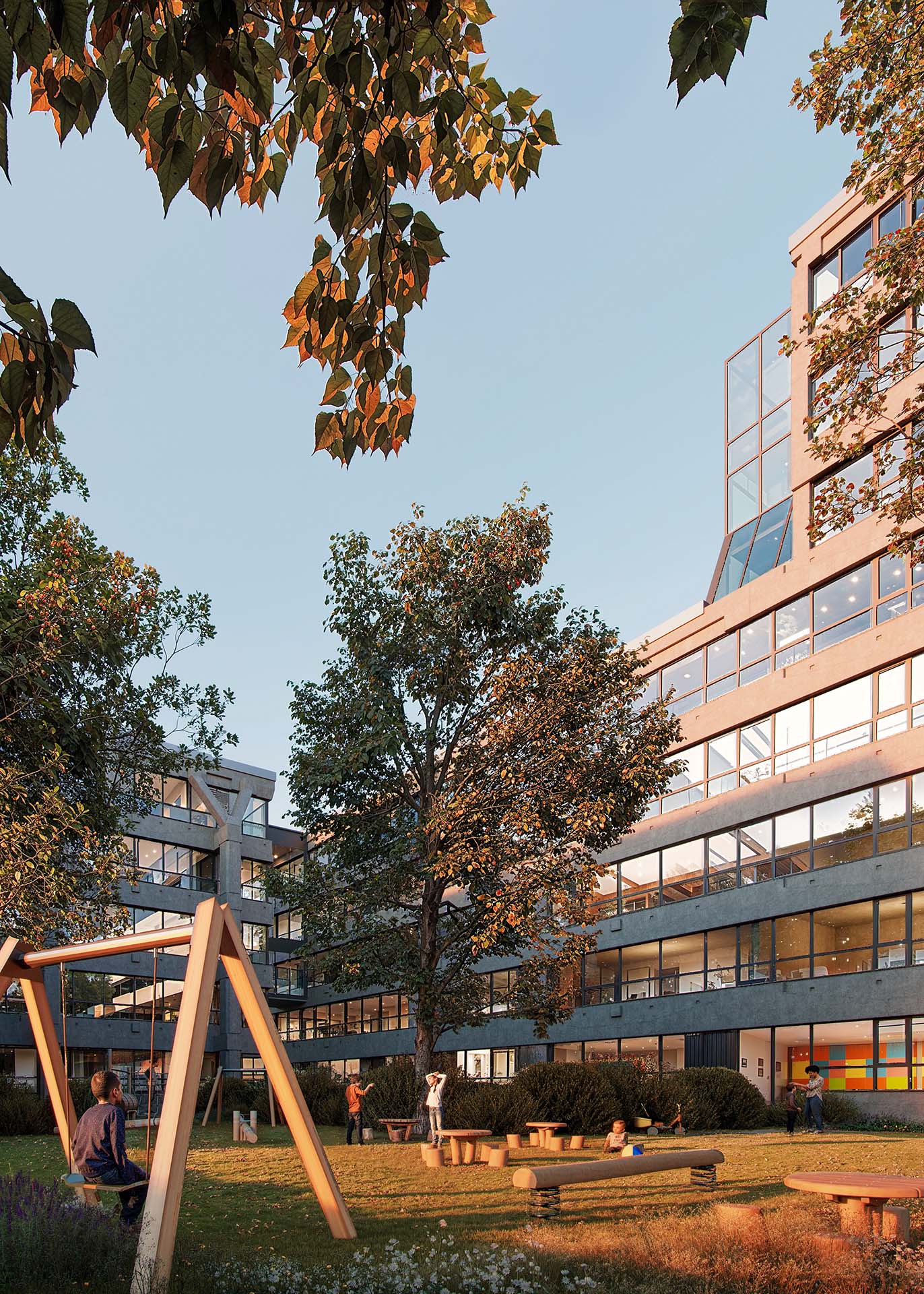 Parallel werden umfassende Maßnahmen zur Ressourceneffizienz umgesetzt: Auf allen 15 Dächern entstehen Photovoltaikanlagen, die rund 324 MWh Strom pro Jahr erzeugen, etwa 123 Tonnen CO₂ einsparen und vollständig im Gebäude genutzt werden können. Regen- und Grauwasser sollen zur Bewässerung der begrünten Flächen dienen. Moderne Wärmerückgewinnungssysteme reduzieren Energieverluste, und der geplante Anschluss an das Fernwärmenetz minimiert Erzeugungsverluste und macht eine eigene Heizungsanlage überflüssig – ein entscheidender Schritt in Richtung energieeffizienter Gebäudebetrieb.