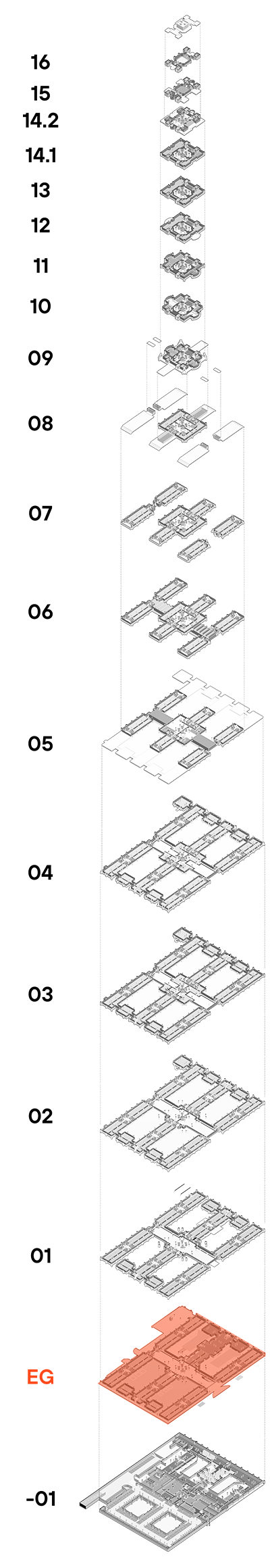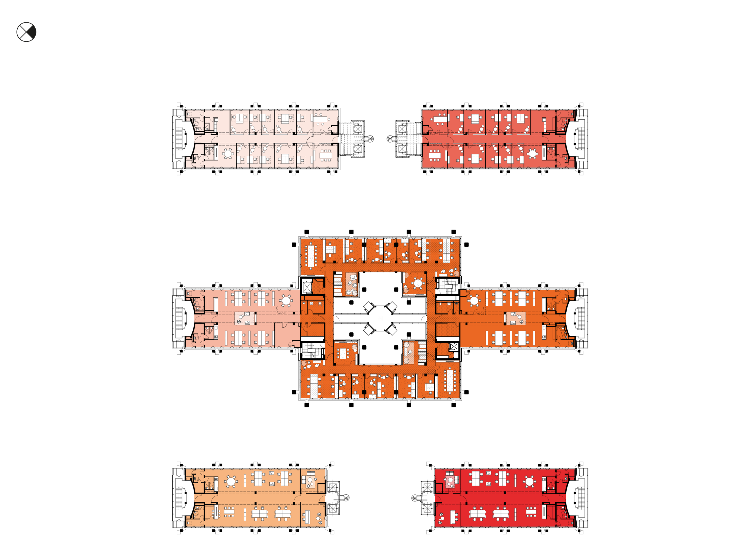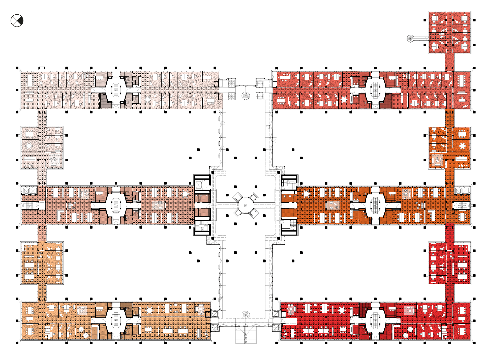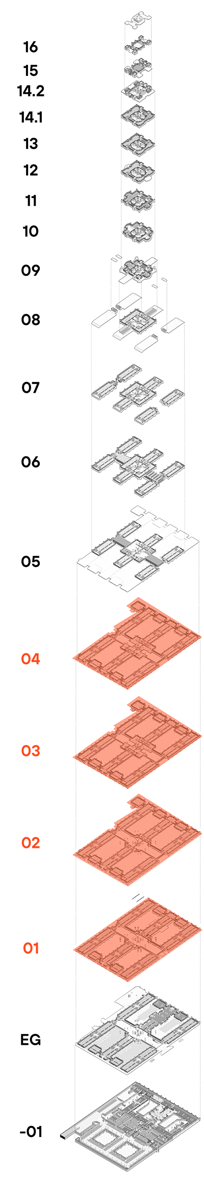 Auf insgesamt ca. 51.000 m² entstehen flexible, vertikal wie horizontal teilbare Büroflächen. Die Mieteinheiten reichen von kompakten 350 m² bis zu großzügigen 5.500 m² pro Ebene. Geschosshöhen von bis zu 3,60 m, lichtdurchflutete Räume, moderne Ausbauten und aufschließbare Fenster ermöglichen variable Arbeitskonzepte – von Open Space über Kombizonen bis zu House-in-House-Lösungen mit eigenem Zugang.