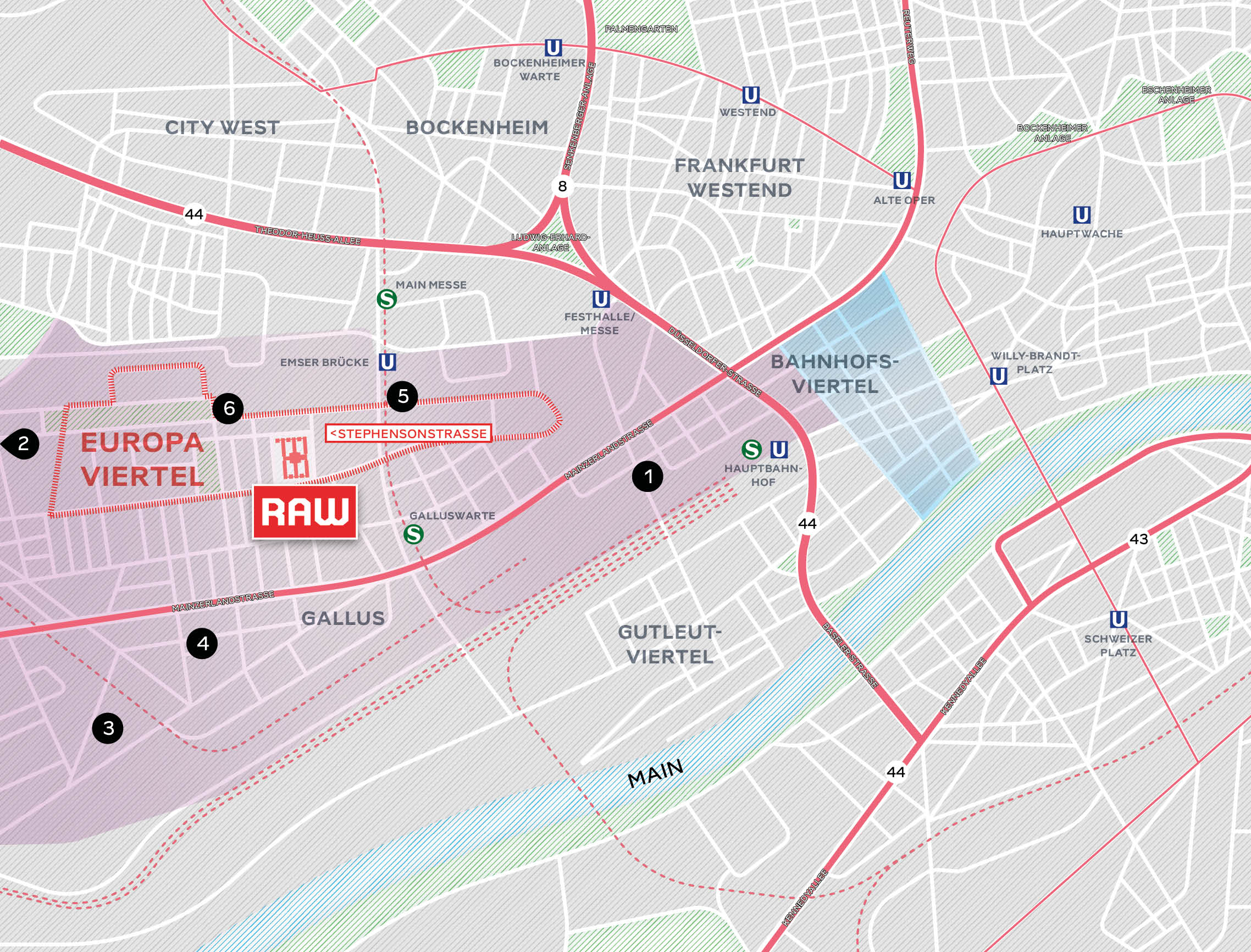 Das RAW an der Stephensohnstraße 1 liegt zentral zwischen Gallus, Bahnhofsviertel, Messe und Europaviertel – in einem der dynamischsten Entwicklungsräume Frankfurts. Zahlreiche gastronomische Angebote, Nahversorger sowie Fitness- und Kulturangebote sind fußläufig erreichbar – unter anderem im Europaviertel und im Skyline Plaza.