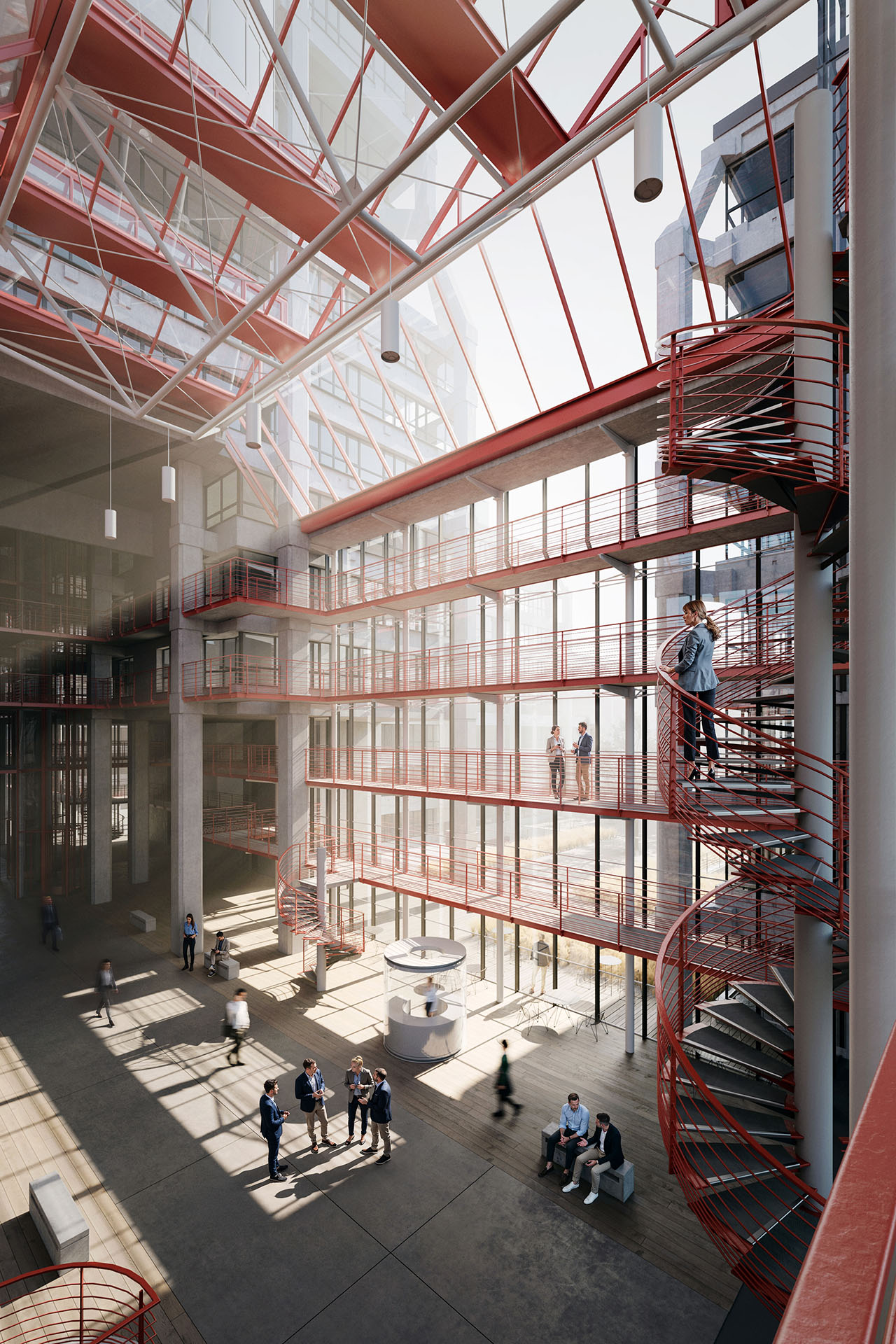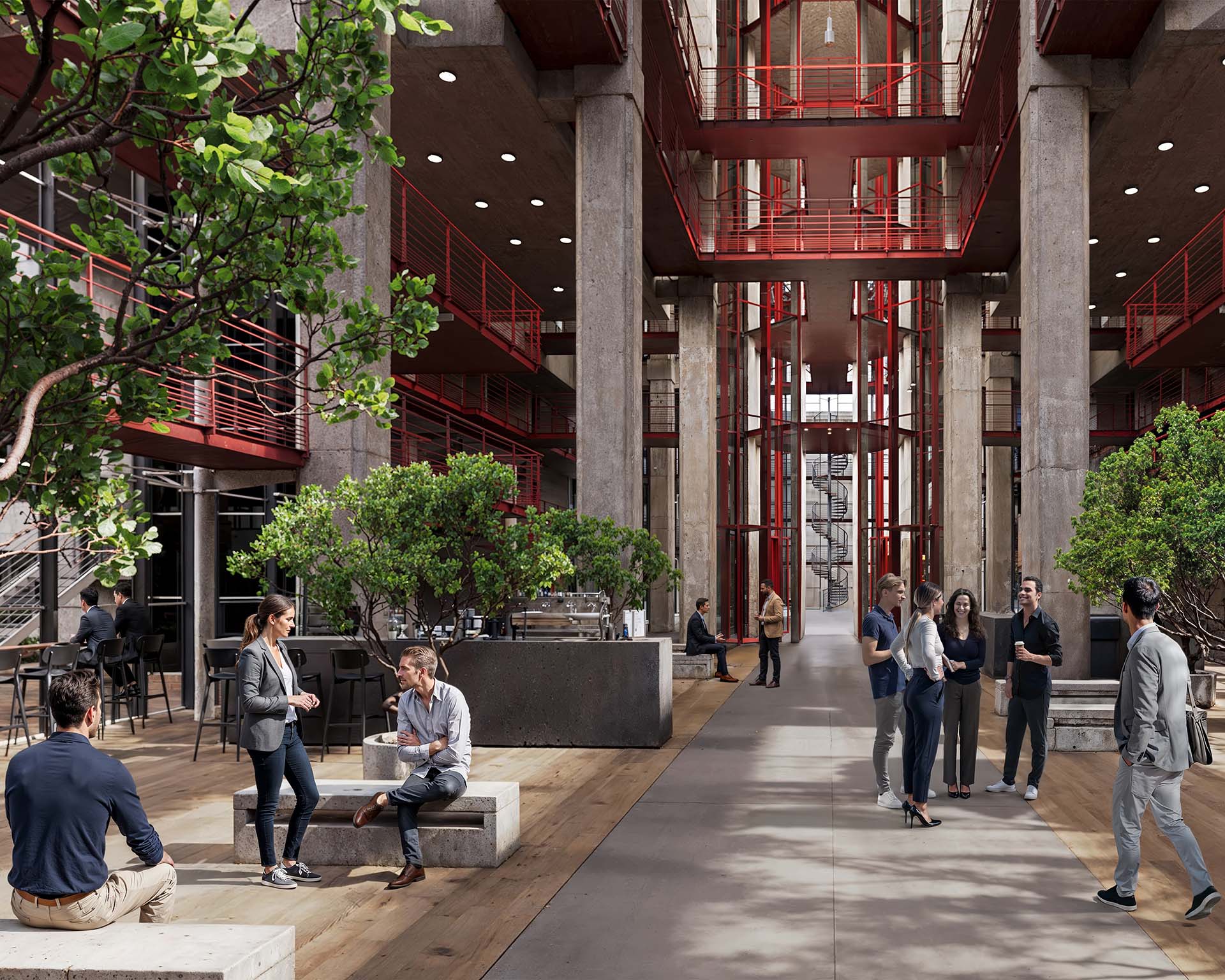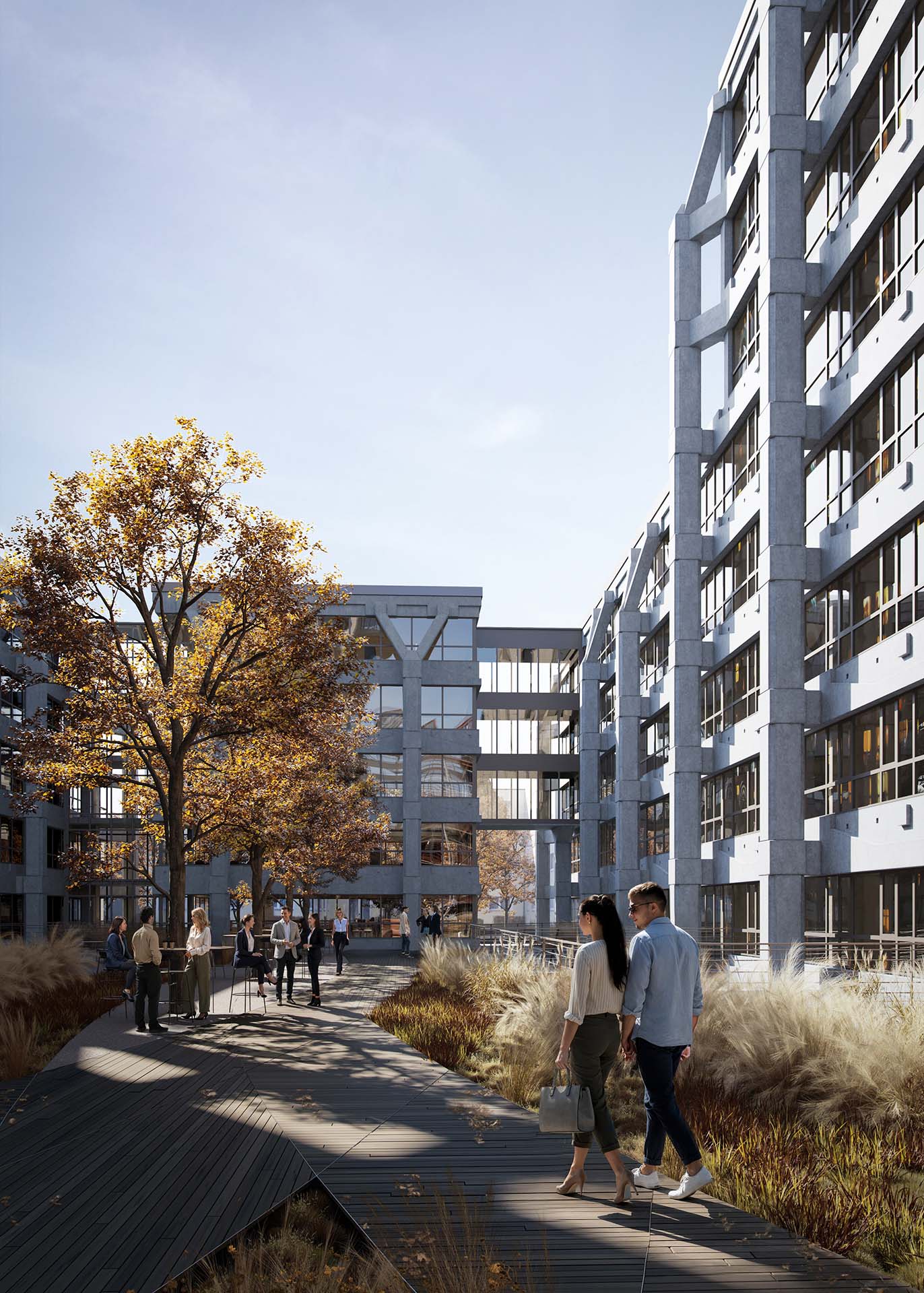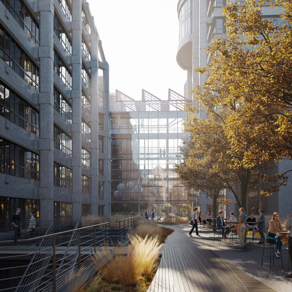 Das RAW wächst über sich hinaus: Auf allen Ebenen zeigt sich der Business Campus als multifunktionales Gebäude-Ensemble mit flexibel anpassbaren Büroflächen, die Offenheit und Modernität neu erlebbar machen. Vor allem aber ist es ein Ort der Begegnung – mit einer zentralen Halle, die alles bereithält, was den Arbeitsalltag vereinfacht und bereichert: vom schnellen Espresso über das Workout nach Feierabend bis zum Meeting unter Bäumen in den grünen Höfen des Campus. Wie ein Dorf in der Stadt vereint der RAW Business Campus Café, Restaurant, Fitness, Bibliothek und Retail-Flächen zu einem lebendigen Treffpunkt für Arbeiten, Austausch und Inspiration.